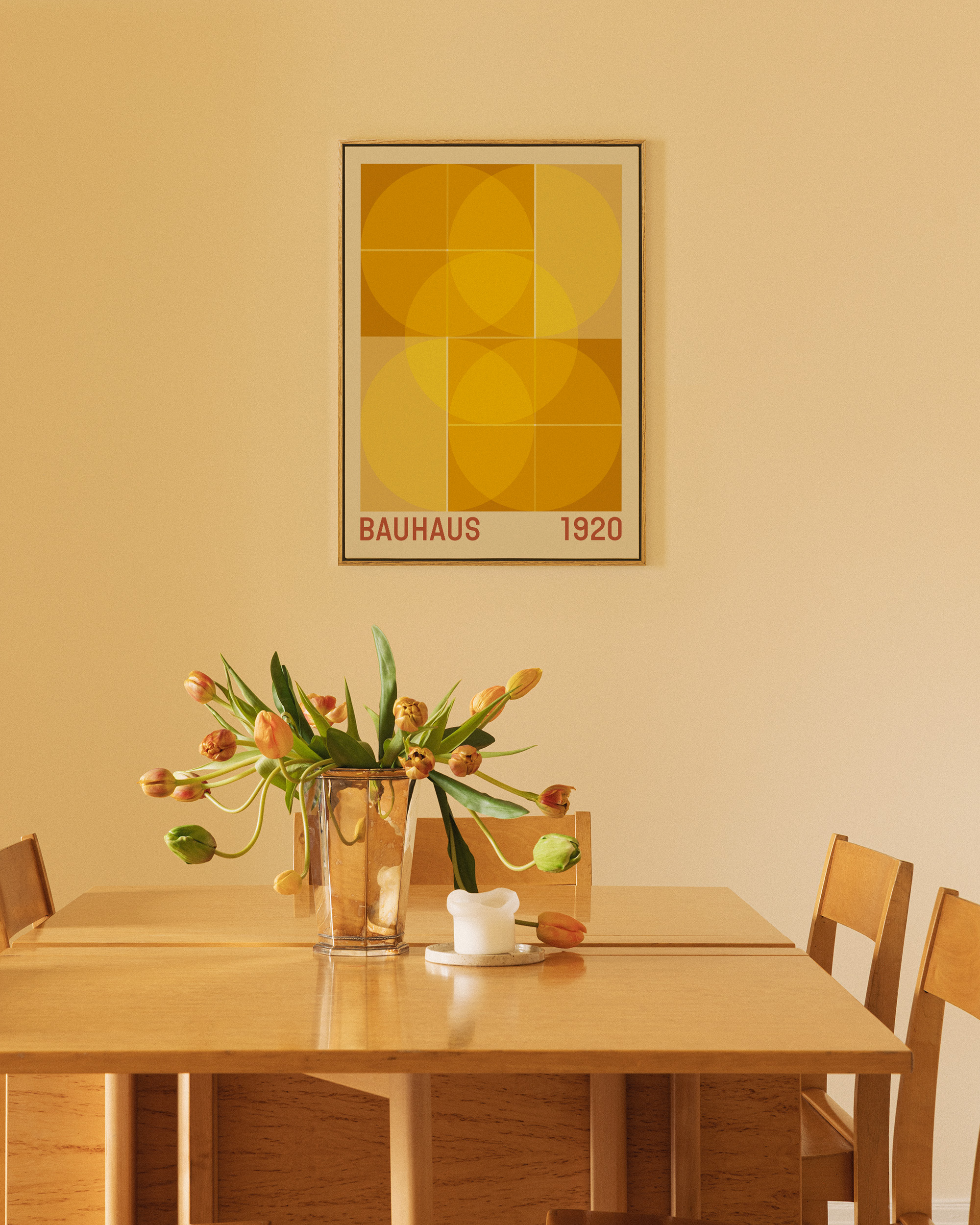 Από 19,95 €Ένας καμβάς με επικαλυπτόμενους κίτρινους και πορτοκαλί κύκλους σε μπεζ φόντο, εμπνευσμένος από το σχέδιο Bauhaus του 1920.