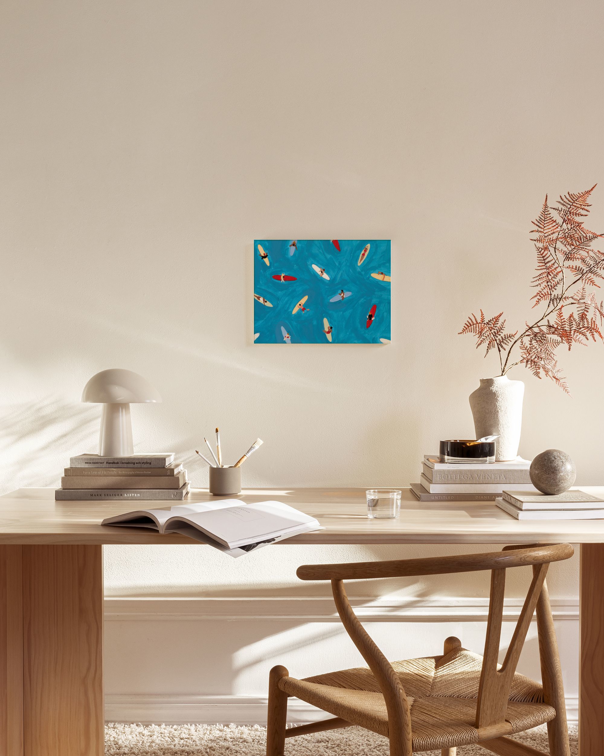 Από 19,95 €Ένας καμβάς που δείχνει ανθρώπους να χαλαρώνουν πάνω σε πολύχρωμες σανίδες του σερφ σε τυρκουάζ νερά. Οι σανίδες του σερφ είναι σε κόκκινο, άσπρο, κίτρινο και μπλε χρώμα.