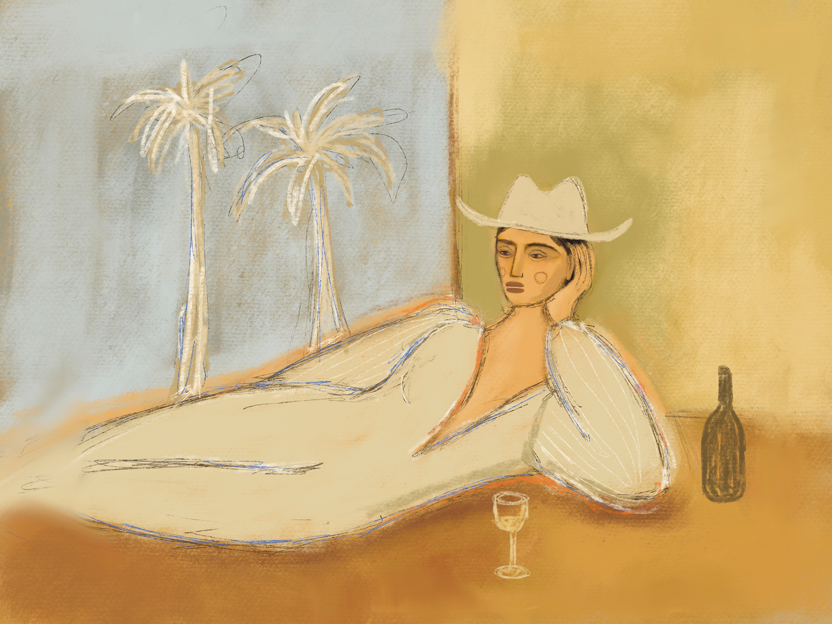 Από 65,85 €Ένα πόστερ που απεικονίζει ένα άτομο με λευκό ρούχο και καπέλο να χαλαρώνει στο έδαφος με ένα μπουκάλι και ποτήρι κοντά του. Δύο φοίνικες μπροστά σε έναν μπλε ουρανό ολοκληρώνουν αυτή την ήρεμη σκηνή σε απαλούς κίτρινους και μπεζ τόνους.