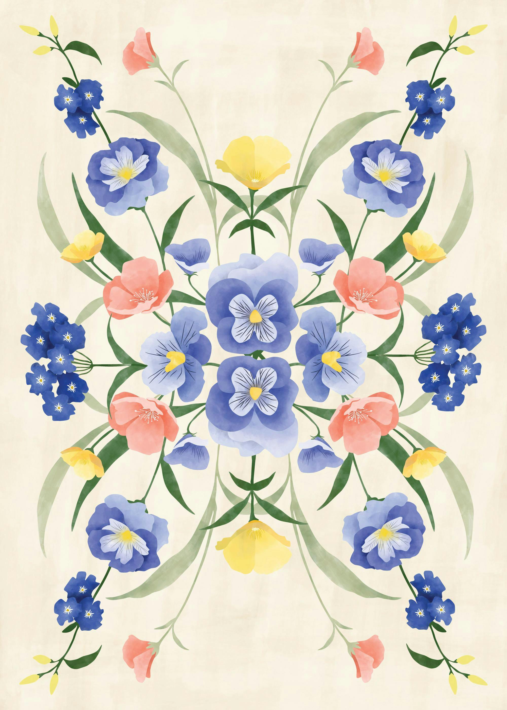 Από 7,80 €Ένα πολύχρωμο poster που απεικονίζει ροζ, κίτρινα και μπλε λουλούδια με πράσινα φύλλα σε κρεμ φόντο. Ιδανικό για να φωτίσει οποιοδήποτε δωμάτιο.