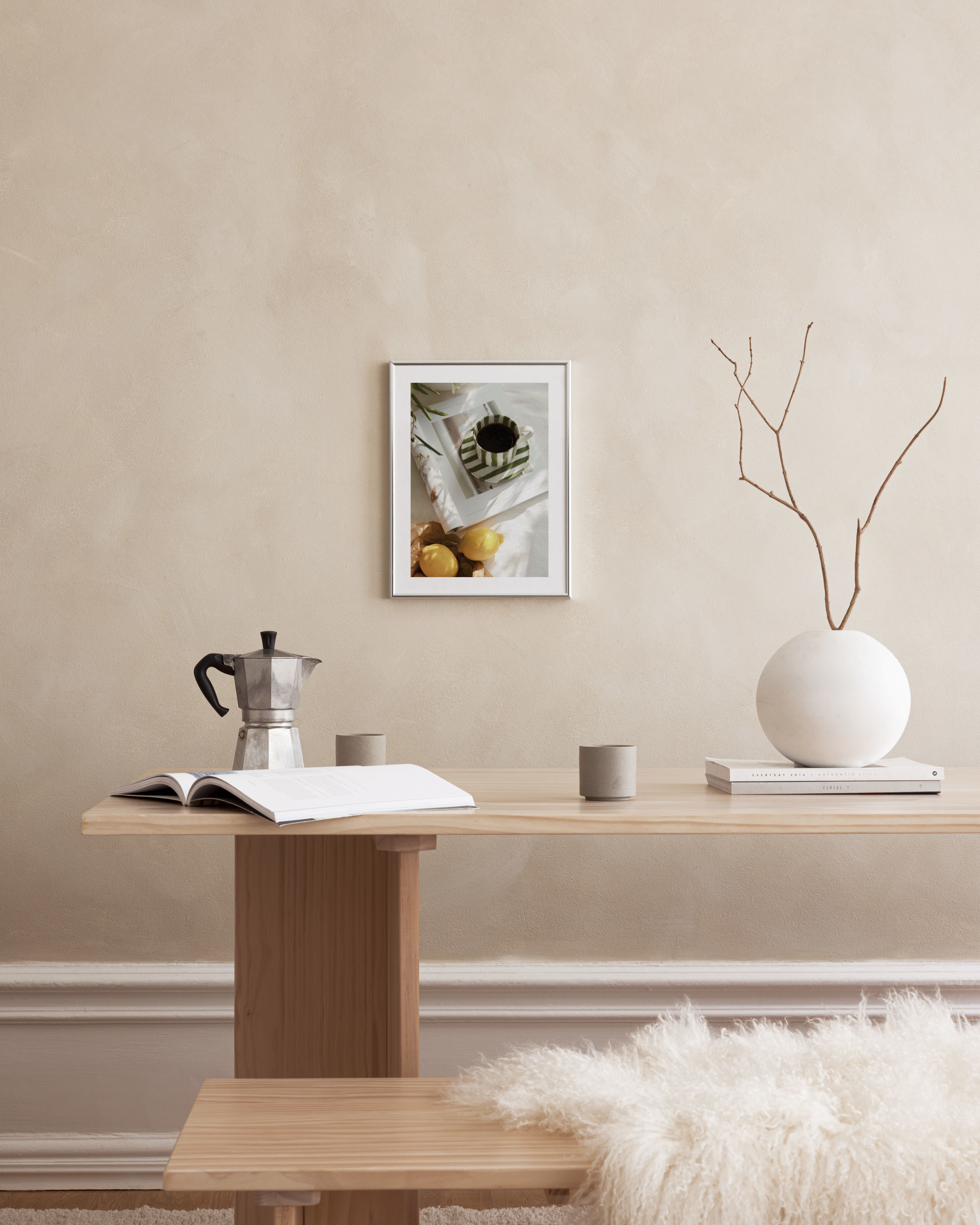 Από 13 €Poster που απεικονίζει ένα ριγέ φλιτζάνι καφέ πάνω σε ένα βιβλίο δίπλα από κάποια λεμόνια. Μια όμορφη φωτογραφική αφίσα σε απαλές αποχρώσεις.